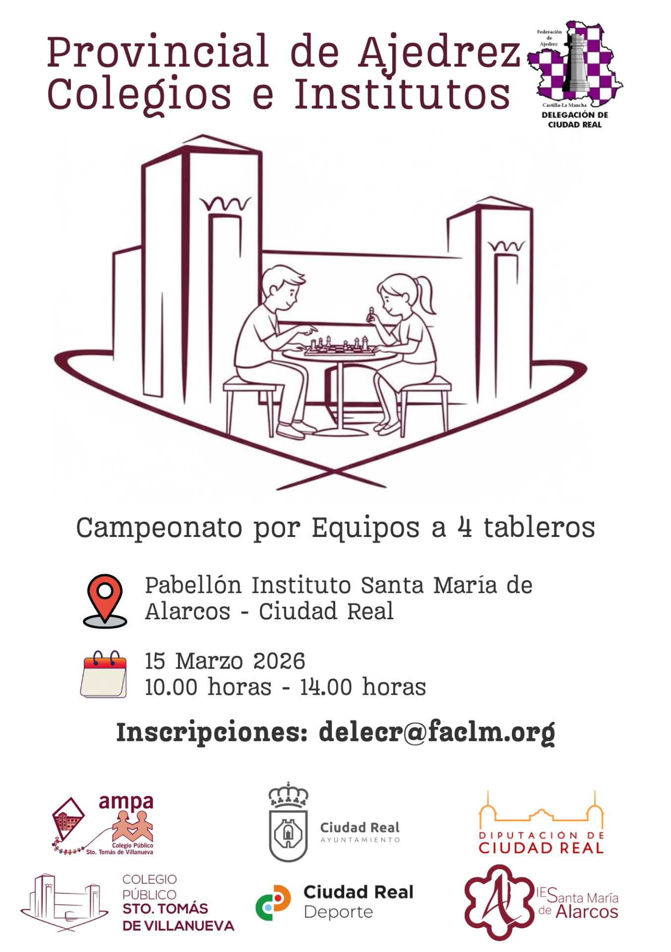 El pasado Domingo 16 de Marzo, tuvo lugar en el Pabellón de Frontón de la Ciudad Deportiva de Valdepeñas los Campeonatos Provinciales de Ajedrez por Equipos de Colegios e Institutos. Contando con una participación de 232 escolares, repartidos en 51 equipos de toda la provincia. Las competiciones se disputaron a 6 rondas desde las 10:00 hasta las 14:00 h.